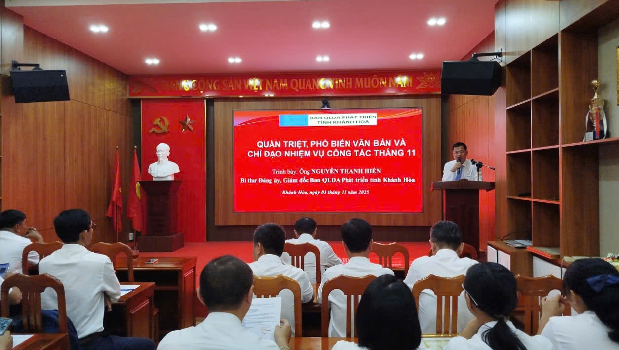 Trong phần quán triệt nhiệm vụ trọng tâm tháng 11/2025, Bí thư Đảng ủy - Giám đốc Ban QLDA, ông Nguyễn Thanh Hiến đã quán triệt các nội dung tuyên truyền tháng 11, đặc biệt Tuyên truyền kết quả Hội nghị Trung ương 13 khóa XIII và định hướng phát triển giai đoạn 2025–2030; và Triển khai các nhiệm vụ phát triển kinh tế - xã hội năm 2025, trọng tâm là đẩy nhanh giải ngân đầu tư công “đúng – trúng – nhanh – hiệu quả” và thực hiện hiệu quả đánh giá công tác bằng bộ chỉ số KPI.