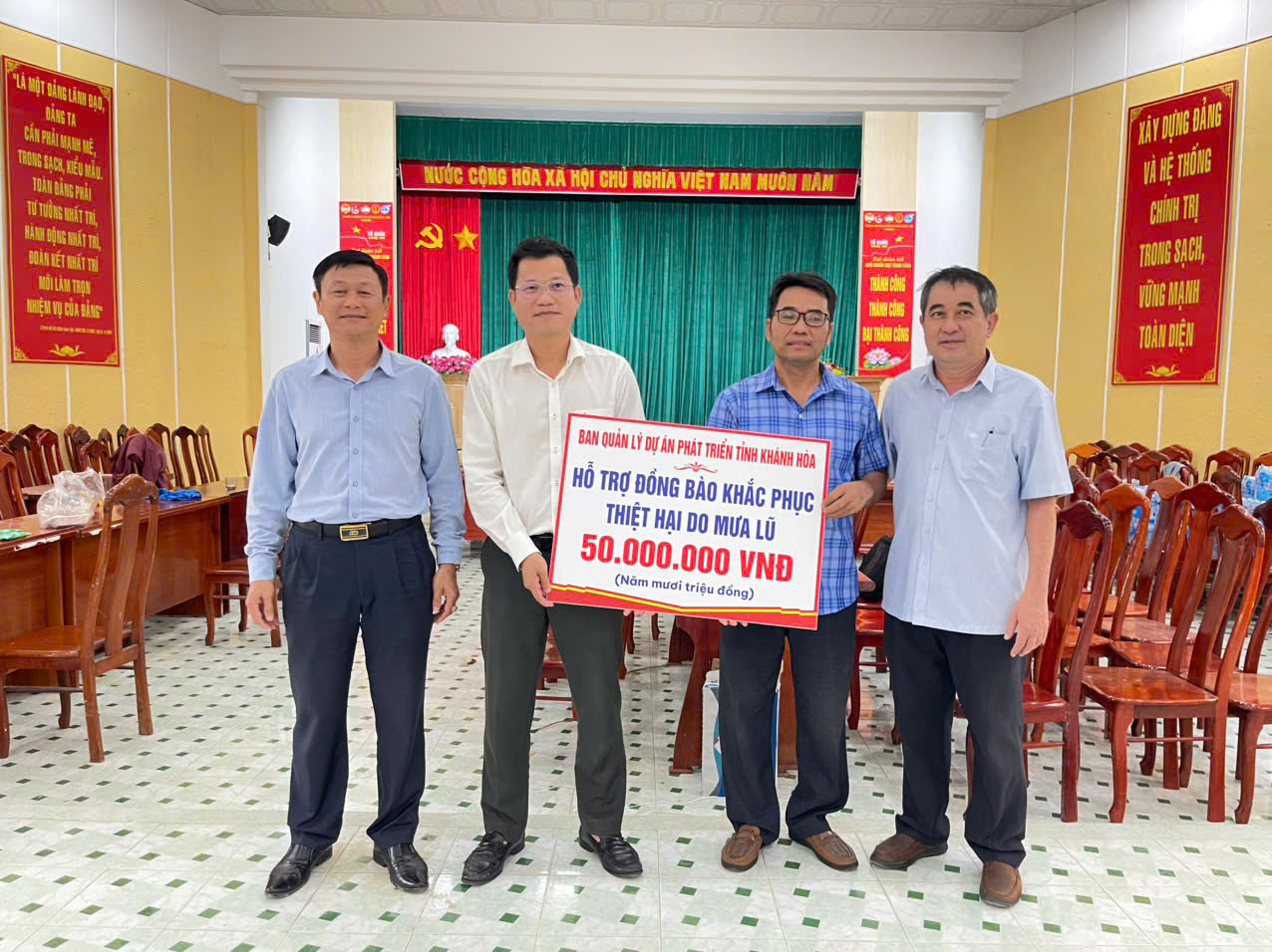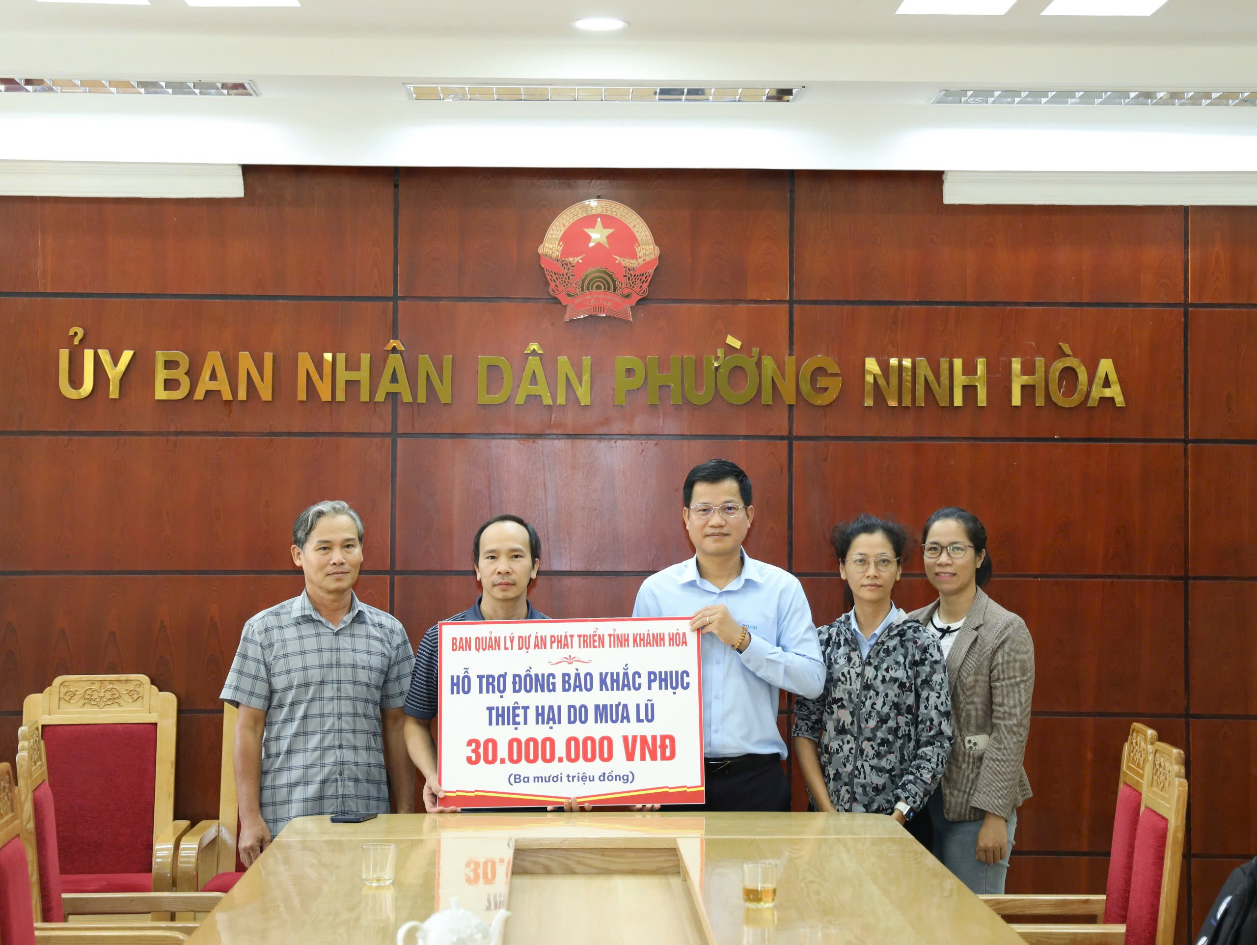 Lãnh đạo Ban Quản lý dự án Phát triển tỉnh trao bảng tượng trưng ủng hộ người dân Phường Nam Nha Trang khắc phục thiệt hại do mưa lũ.