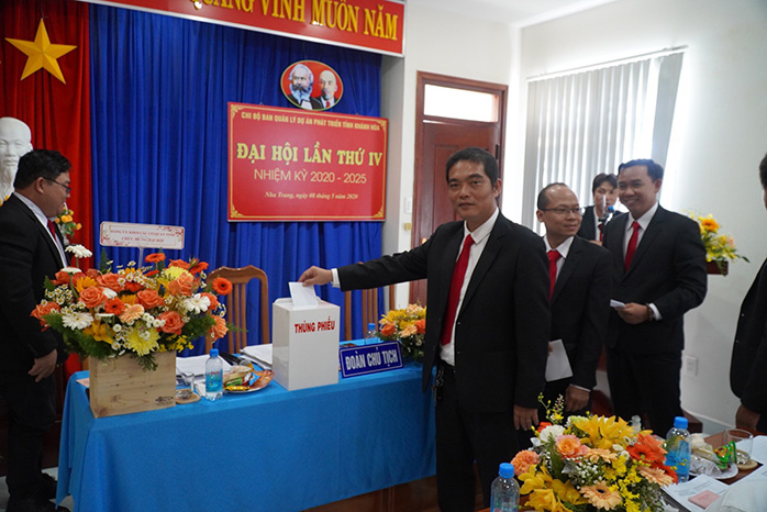Tiếp đó, trên tinh thần dân chủ, trách nhiệm, Đại hội tiến hành bầu Ban chấp hành Chi bộ nhiệm kỳ 2020-2025 khóa mới, bầu Bí thư Chi bộ, Phó Bí thư Chi bộ nhiệm kỳ 2020 – 2025 và bầu đại biểu dự Đại hội đại biểu Đảng bộ khối các cơ quan tỉnh thứ VIII. Sau một thời gian làm việc nghiêm túc với tinh thần dân chủ, đoàn kết và trí tuệ, Đại hội đã bầu ra Ban chấp hành Chi bộ Ban QLDA Phát triển tỉnh Khánh Hòa lần thứ IV, nhiệm kỳ 2020-2025, gồm 05 đồng chí: