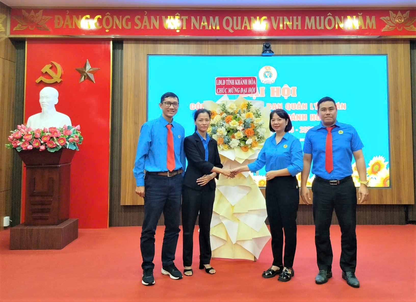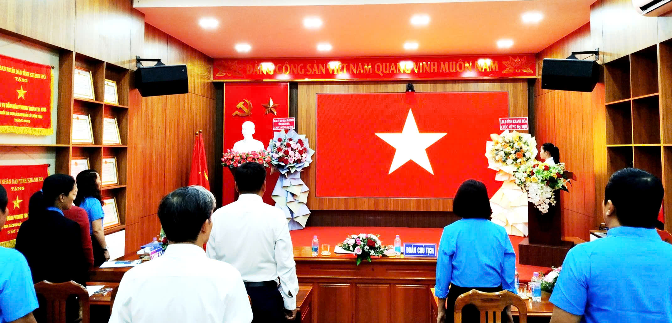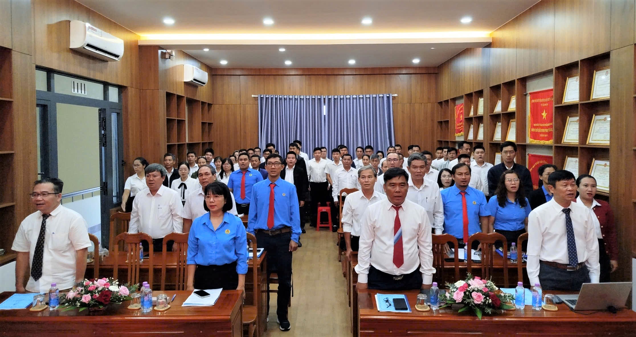 Đại hội bắt đầu bằng nghi thức Chào cờ, hát Quốc ca và Công đoàn ca