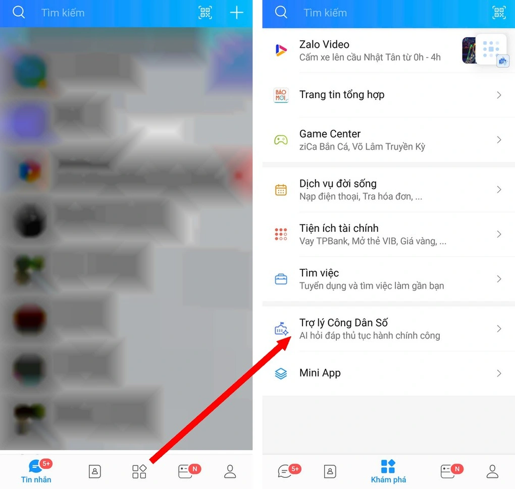 - Từ giao diện chính của Zalo, nhấn vào mục “Khám phá” ở menu bên dưới, sau đó chọn “Trợ lý Công dân số” tại danh sách hiện ra.