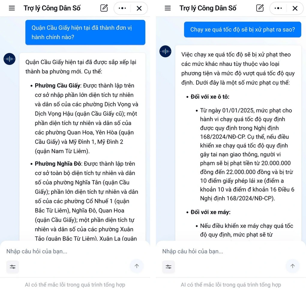 Không chỉ giúp giải quyết các câu hỏi liên quan đến thủ tục hành chính, người dùng cũng có thể sử dụng công cụ AI này để tra cứu về các đơn vị hành chính mới sau khi tiến hành sáp nhập, các mức xử phạt vi phạm hành chính khi tham gia giao thông…