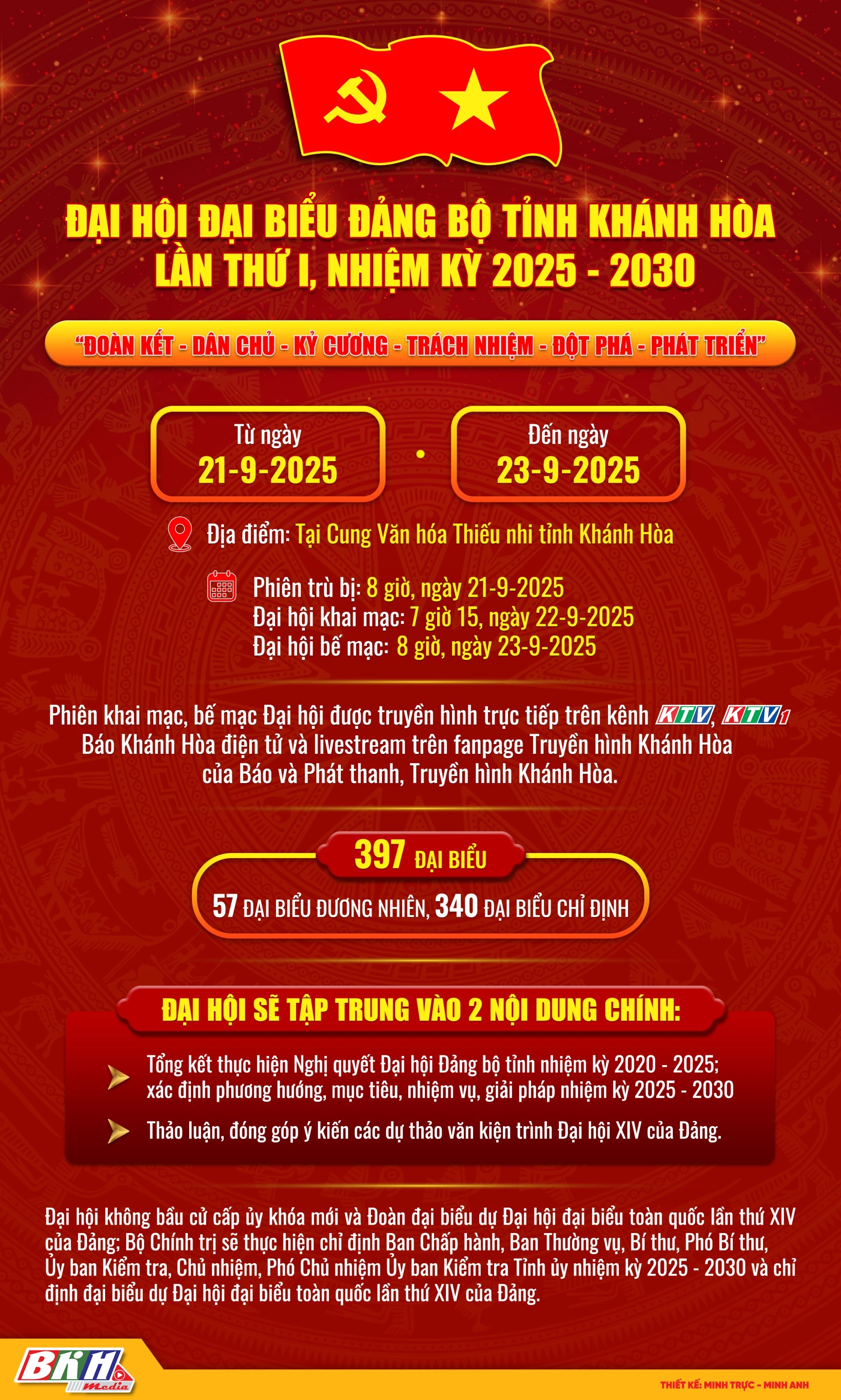 Đại hội đại biểu Đảng bộ tỉnh Khánh Hòa lần thứ I, nhiệm kỳ 2025 - 2030 diễn ra từ ngày 21 đến 23-9 tại Cung Văn hóa Thiếu nhi tỉnh, với sự tham dự của 397 đại biểu, đại diện cho gần 74.000 đảng viên trong toàn Đảng bộ.