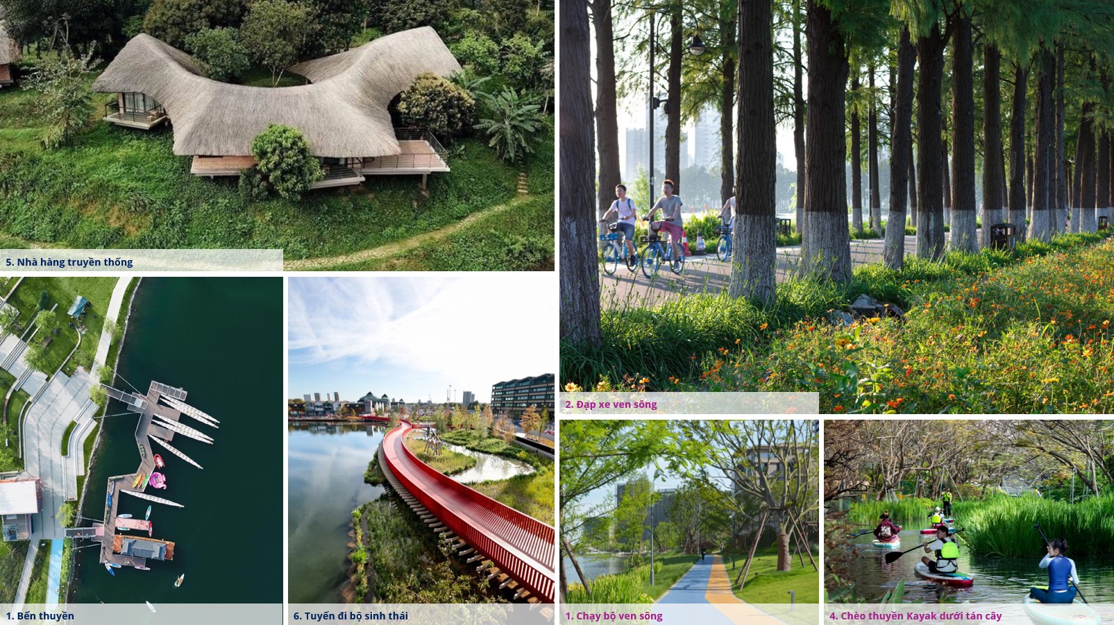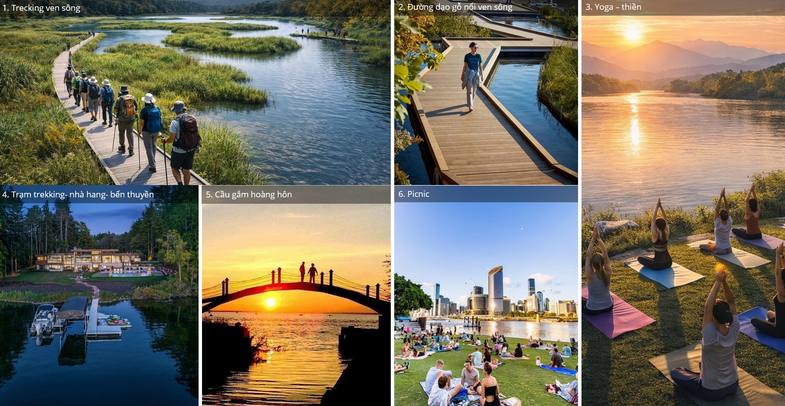 Ở sông Tắc là các đoạn như thủy nguyên, tuyền lâm, miệt vườn, sinh lực… thiên về văn hóa bản địa, sinh thái, trekking, kayak, camping và dịch vụ trải nghiệm ven sông. Mép sông mở và dễ tiếp cận, với bố cục nhiều lớp từ mặt nước, bờ sông, không gian công cộng, cây xanh và giao thông chậm, rồi mới đến công trình phía sau. Tức là tránh kiểu xây kín bờ sông, tránh tường rào và mặt đứng quay lưng ra nước; thay vào đó là tầng trệt mở, các khoảng lùi hợp lý, công viên tuyến tính, sân bậc xuống nước, điểm ngắm cảnh, quảng trường và các công trình điểm nhấn.