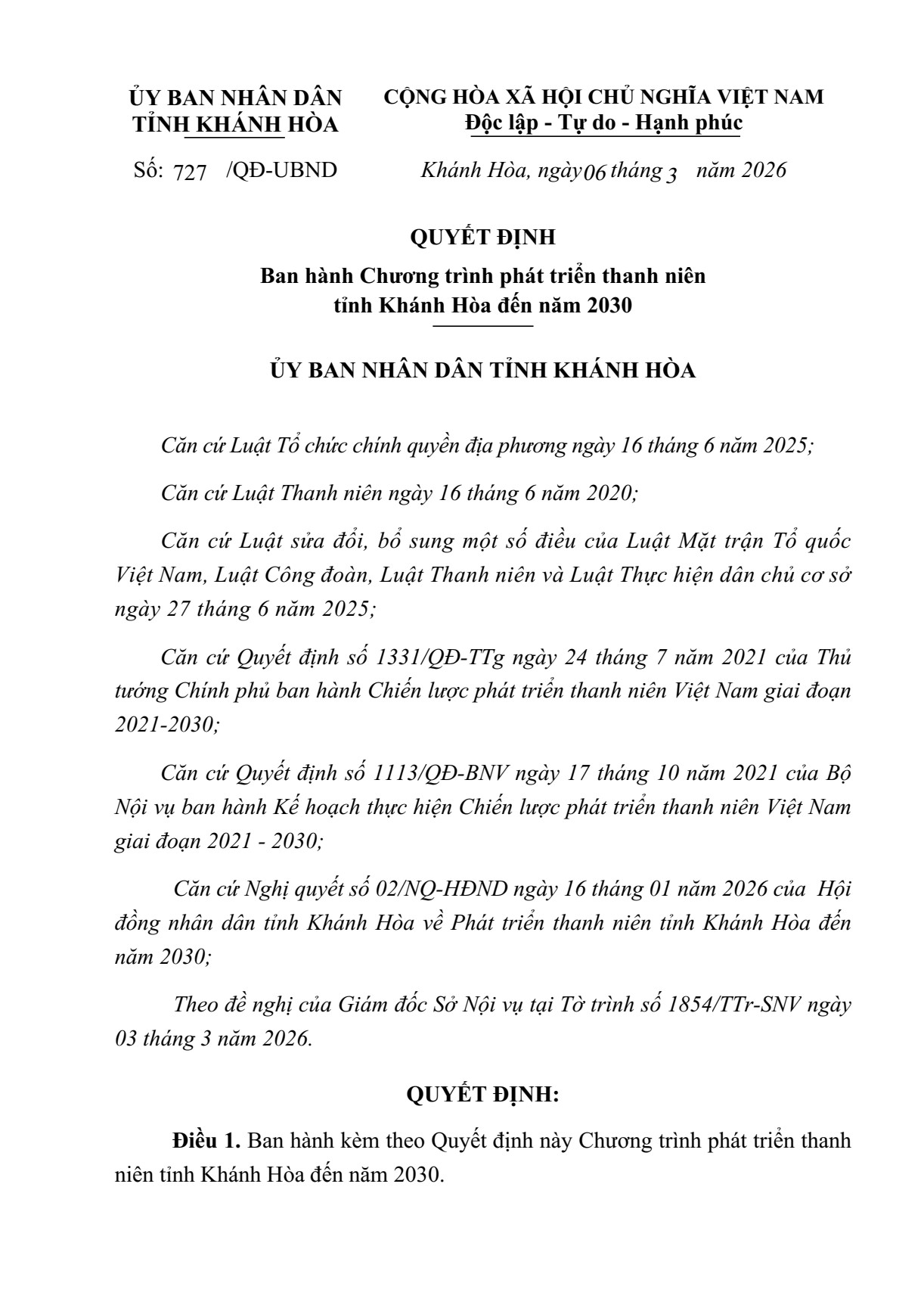 Ngày 06/3/2026, UBND tỉnh Khánh Hòa đã ban hành Kế hoạch số 727/QĐ-UBND về Chương trình phát triển thanh niên tỉnh Khánh Hòa đến năm 2030.