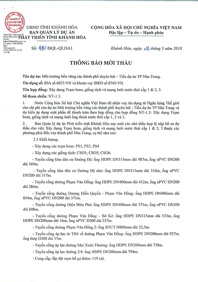 Tên Dự án: Môi trường bền vững các thành phố duyên hải - Tiểu dự án TP Nha Trang.Tín dụng số: IDA số 6027-VN và khoản vay IBRD số 8745-VN.